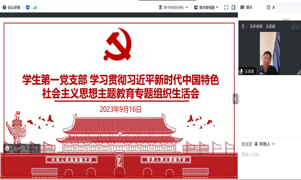 9月16日晚,学生第一党支部召开学习贯彻习近平新时代中国特色社会主义思想主题教育专题组织生活会,会议采用线上形式,由支部书记王迎波主持,支部全体党员参加。