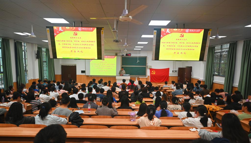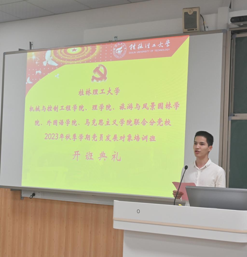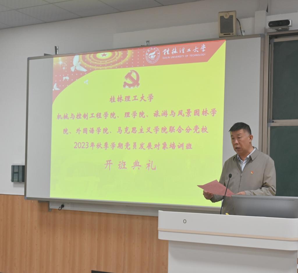 为深入学习贯彻习近平新时代中国特色社会主义思想和党的二十大精神,切实提高党员发展质量,11月10日中午,机械控制与工程学院、理学院、旅游与风景园林学院、外国语学院、马克思主义学院联合分党校2023年秋季学期党员发展对象培训班开班典礼在雁山校区06105教室举行。机械控制与工程学院党委书记李治出席开班典礼。开班典礼由培训班班主任、机械控制与工程学院组织员韩波主持。来自机械控制与工程学院、理学院、外国语学院、旅游与风景园林学院、马克思主义学院共151名培训班学员参加了本次典礼。