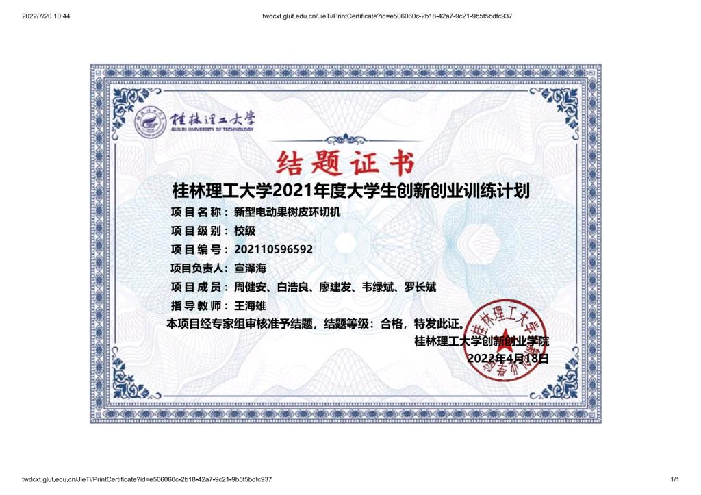 1、2021-2022年参与项目《新型电动果树皮环切机》获校级大创结题;