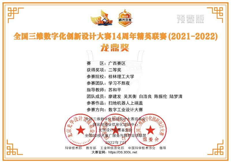 2、2021-2022年参与全国三维数字化创新设计大赛精英联赛获区级二等奖;