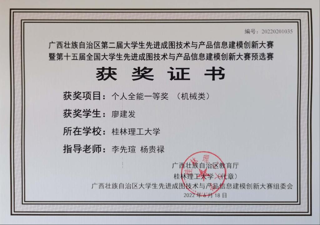 1. 第十五届高教杯全国大学生先进成图技术与产品信息建模创新大赛省赛一等奖;