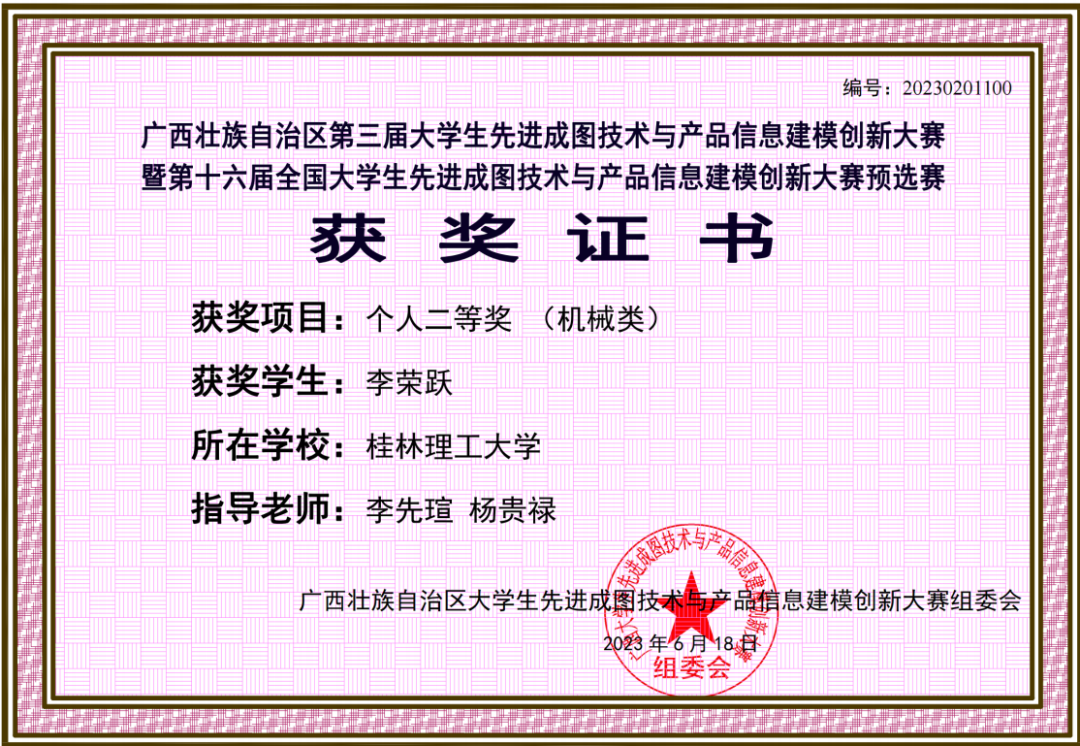 2、2023年6月,广西壮族自治区第三届先进成图技术与产品信息建模创新大赛二等奖;