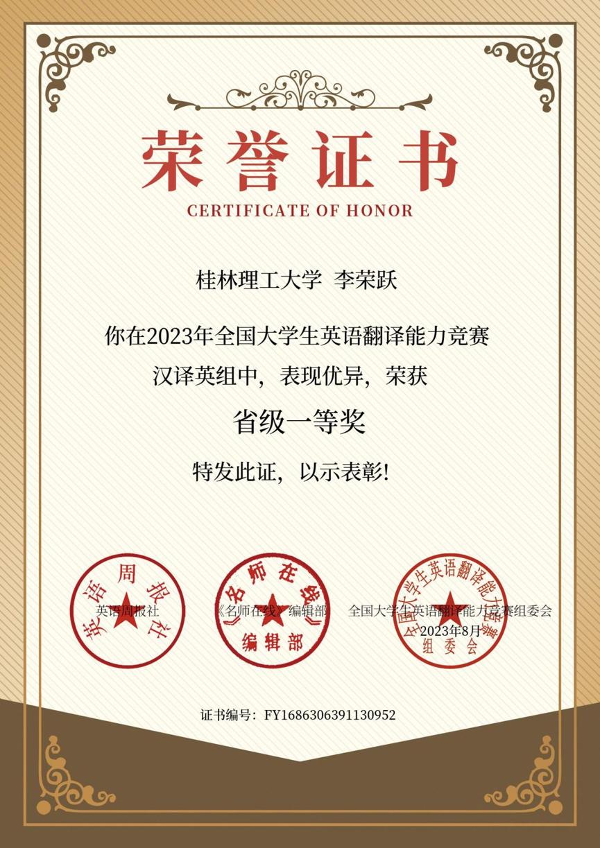 5、2023年8月,全国大学生英语翻译能力竞赛省级一等奖。