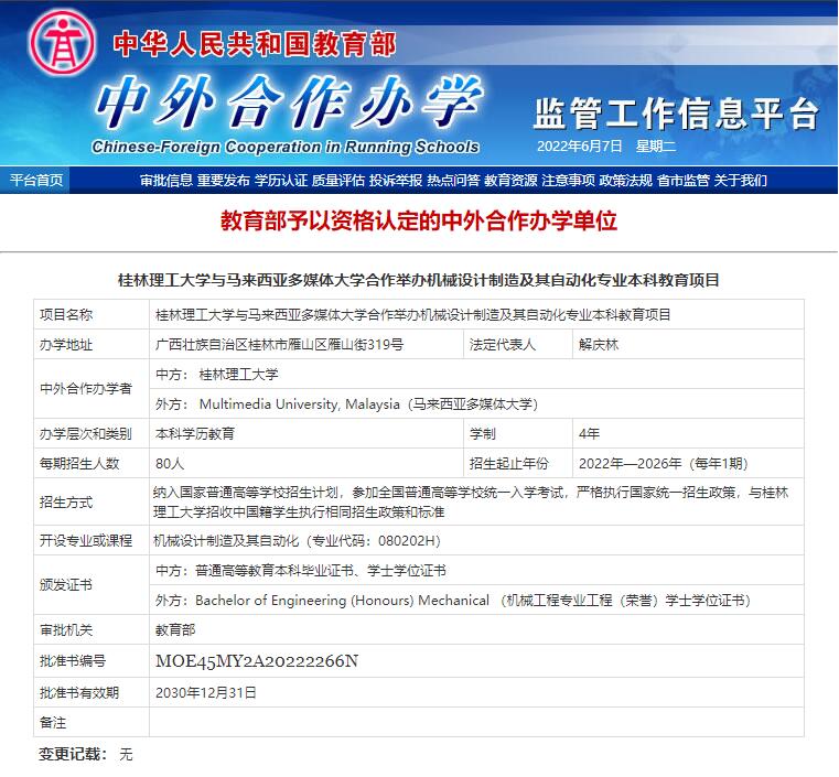 我校申报的与马来西亚多媒体大学合作举办机械设计制造及其自动化专业本科教育项目获教育部批准,项目计划2022年秋季开始面向全国招生。